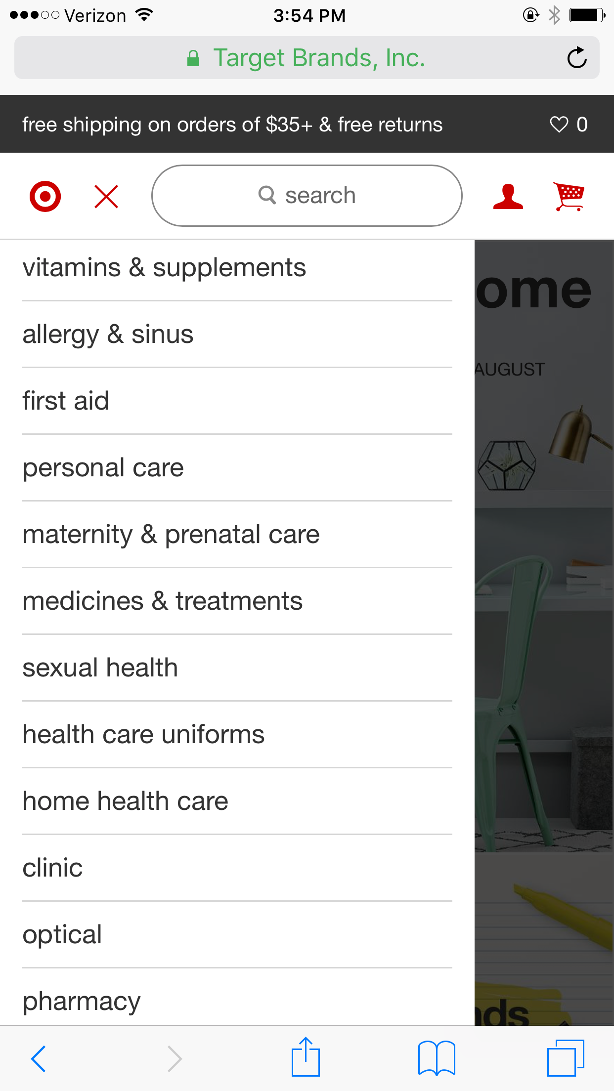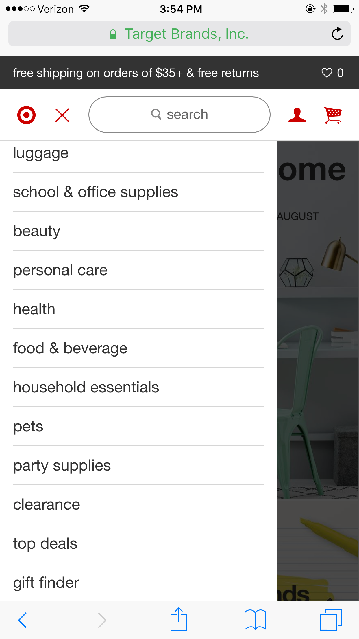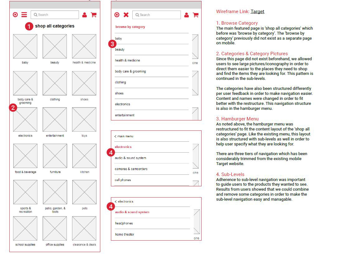 The practicality of mobile websites can be hindered from impractical information architecture. My team members and I came across the mobile website of Target®, and noticed how it does not present site contents in an architecturally sound manner for easy navigation. We wanted to see how we could rearrange the contents, and redesign the information architecture of the site to enhance usability.